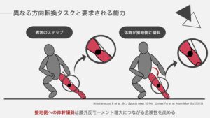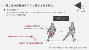 - 方向転換角度が大きい課題では足部を外側に接地することが要求され、安全に方向転換するという観点を持つことの重要性がより高いかもしれない
