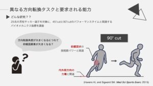 これらの方向転換角度が異なる課題で求められる体力要素は、基本となるところは類似しているものの、