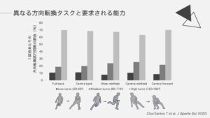 こういった観点で考察してみると、特に方向転換角度が大きい課題を行う頻度が多い競技においては、要求される能力の幅が広いことに気づくことができ、