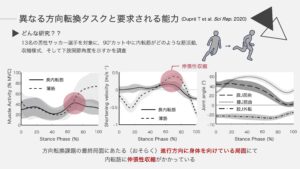 したがって、先ほどの仮説を支持するように方向転換角度が大きい課題の場合には前額面状に素早く力強く蹴り出すといった要求が増すかもしれません。
